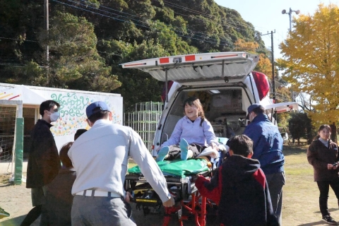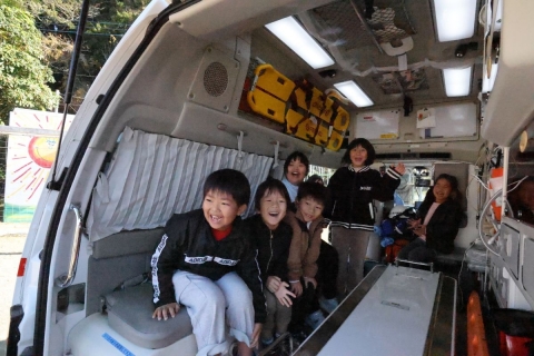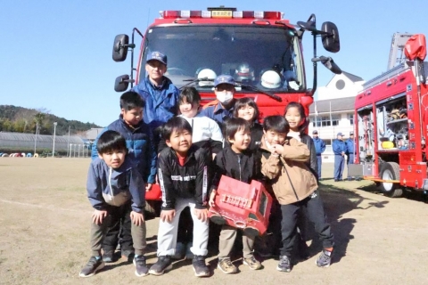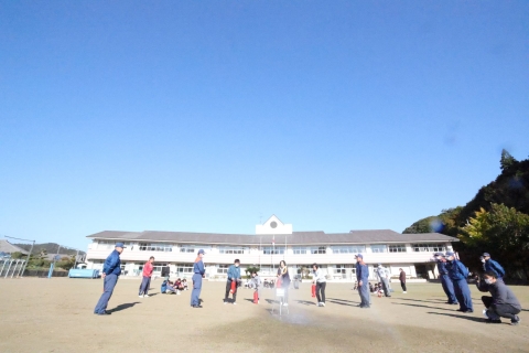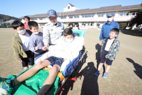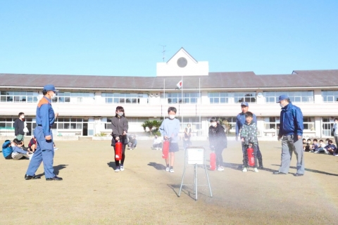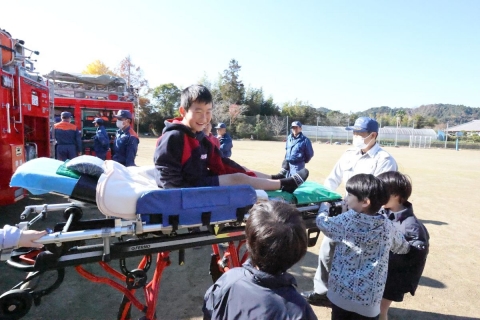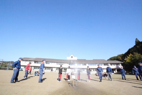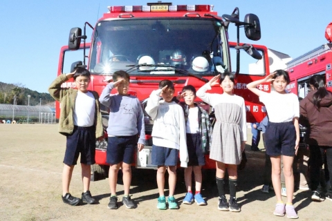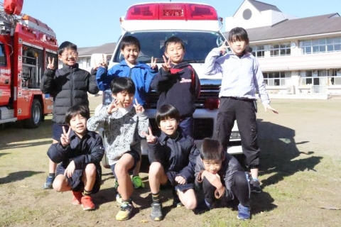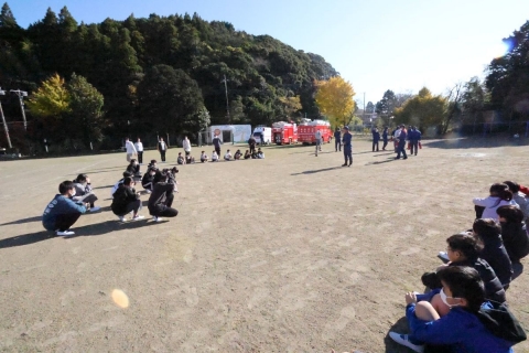 今日は、勝浦消防署の皆さんにご協力いただき、火災避難訓練を行いました。避難を告げる放送が流れると、児童は皆落ち着いて行動し、先生の指示に従って速やかに避難することができました。高学年の5・6年生は、水消火器を使った初期消火の訓練に挑戦し、真剣な表情で実践的な体験をしました。1~4年生は消防車や救急車を見学し、装備の説明を聞きながら興味深そうに車内をのぞき込んでいました。訓練を通して、防災への意識を高める良い機会となりました。