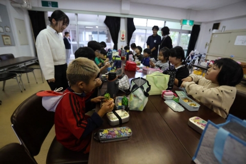 今日は、1年生の算数で数図ブロックを使って学習していました。2年生は音楽室で学習しました。3年生、5年生はALTと楽しく英語の学習、4年生は折れ線グラフのかき方、6年生は対象の図形について学習しました。休み時間も元気に遊んでいました。