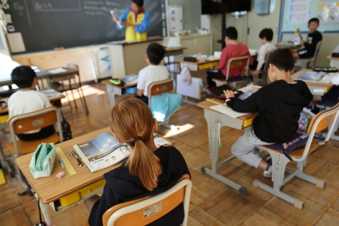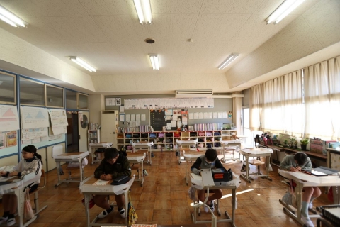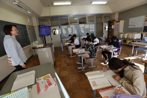 今日は、1年生と2年生が体育で「からだジャンケン」をしました。2年生が1年生に優しく教えてくれていました。2年生は算数で時計の読み方、3年生は書写で毛筆書き、4年生は国語で物語の読み取り、5年生は、理科で天気の変化、6年生は社会で政治の学習をしていました。みんな楽しそうに学習に取り組んでいました。