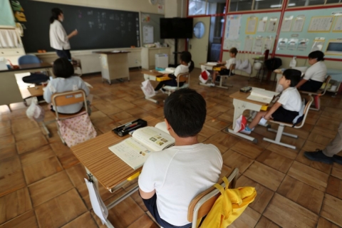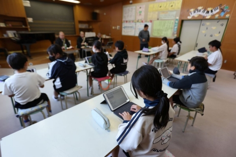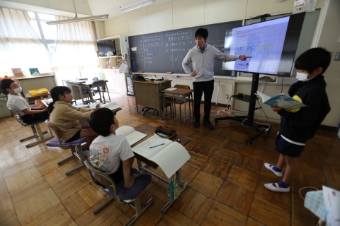 今日は、雨でしたが、子どもたちは、元気に学習に取り組んでいました。1、2年生は、運動会に向けてラジオ体操の練習をしていました。3年生は、算数の解き方をホワイトボードに書いて発表していました。4年生は、タブレットで見つけた植物を写真にとって観察しました。5年生は、図書室で分類番号について調べていました。6年生は、算数の練習問題に取り組みました。