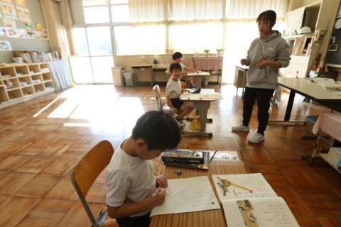 今日も元気に学習に取り組みました。1年生は、アサガオとスイカのつるを使ってリース作りに取り組み、飾り付けまで丁寧に仕上げました。可愛らしい飾りがついて、みんな嬉しそうな表情が印象的でした。2年生は、かけ算九九を単語カードで反復練習。カードを使う形式で、声に出して確認しながら確実に覚えようとする姿が見られました。3年生と4年生は、静かに絵を描く時間。思い思いの題材を選び、色使いや構図に工夫をこらして、集中して取り組んでいました。5年生は習字の時間で、丁寧に字を整えて書いていました。6年生は理科の授業で、リトマス試験紙を用いて水溶液の性質を調べる実験に挑戦。酸性・アルカリ性の判定を行い、変化を観察し記録していました。