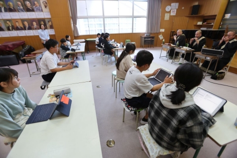今日は、1年生の算数で数図ブロックを使って学習していました。2年生は音楽室で学習しました。3年生、5年生はALTと楽しく英語の学習、4年生は折れ線グラフのかき方、6年生は対象の図形について学習しました。休み時間も元気に遊んでいました。