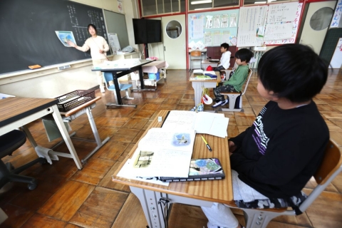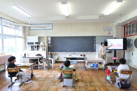 今日は、1年生と2年生が体育で「からだジャンケン」をしました。2年生が1年生に優しく教えてくれていました。2年生は算数で時計の読み方、3年生は書写で毛筆書き、4年生は国語で物語の読み取り、5年生は、理科で天気の変化、6年生は社会で政治の学習をしていました。みんな楽しそうに学習に取り組んでいました。