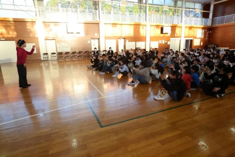 質問し終えた後には,渡辺さんのビニルハウスにおじゃまして,ナスやトマトを見せていただきました。見たこともないほど,大きなナスの背丈や葉に驚いたり、色づき始めたトマトに目を輝かせていました。「また,渡辺さんに教えてもらいたい。」と口々に言っていました。