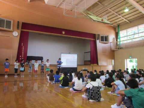 午後1時から体育館で、児童集会がありました。運営委員会から、1学期を振り返っての学校生活の反省と夏休みのきまりについて発表がありました。きまりをしっかり守って、楽しい夏休みが過ごせるといいですね。