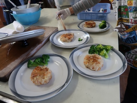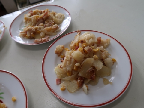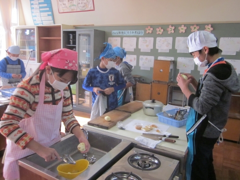 6年生が家庭科の「身近な食品でおかずをつくろう」の学習で,ジャガイモ料理に挑戦しました!廊下まで食欲を誘ういい香りが。 とっても上手にでき,大満足の調理実習となりました。