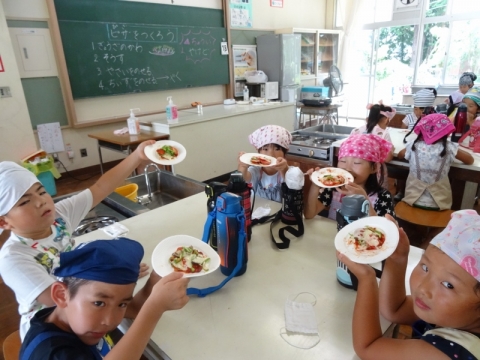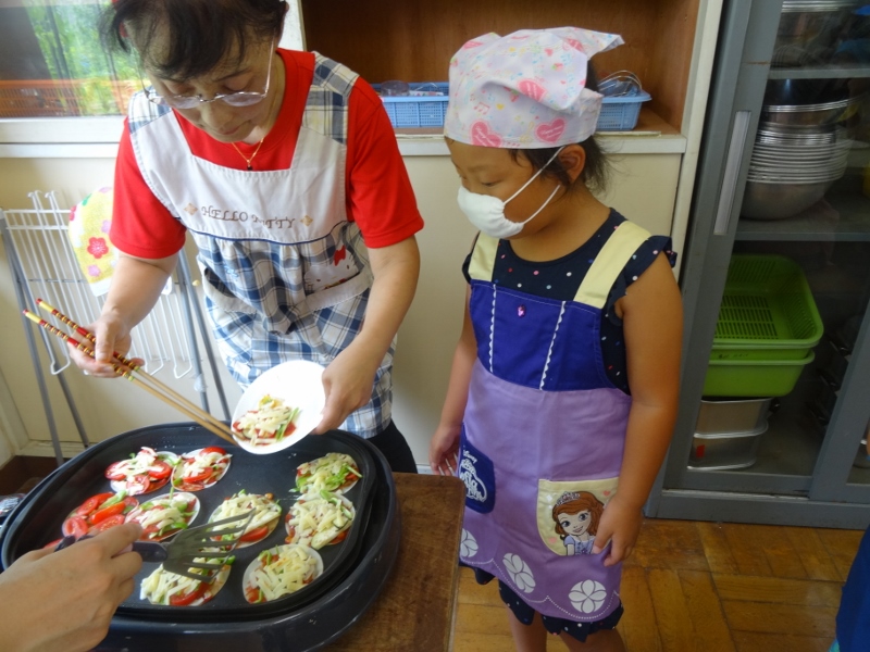 1年生は畑でとれた野菜を収穫しピザづくりを行いました。ギョウザの皮を使っているので一口サイズでかわいいです!