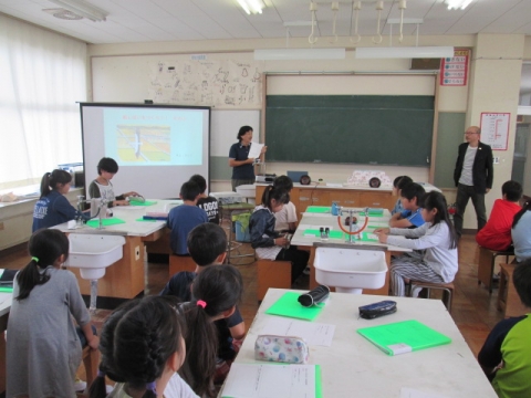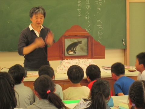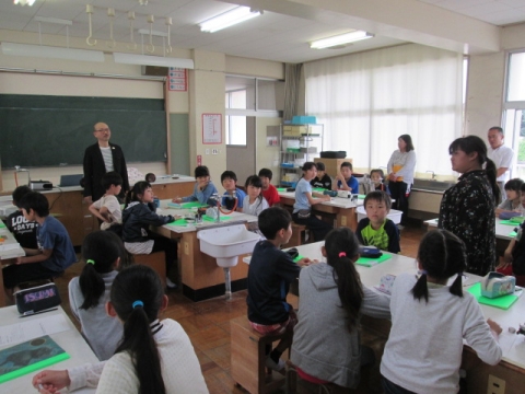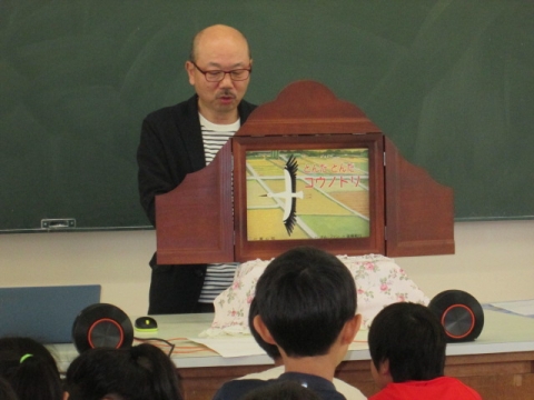 プール開きのあと,理科室では5年生の生物多様性教育ファームの授業が行われました。今回は紙芝居の表現方法について,学びました。