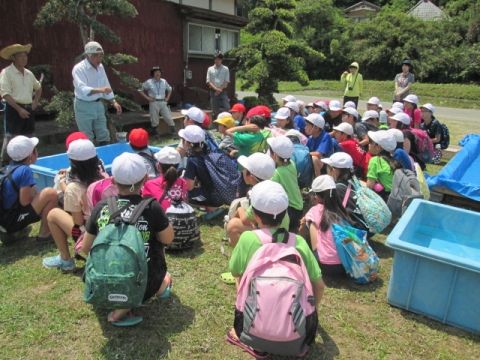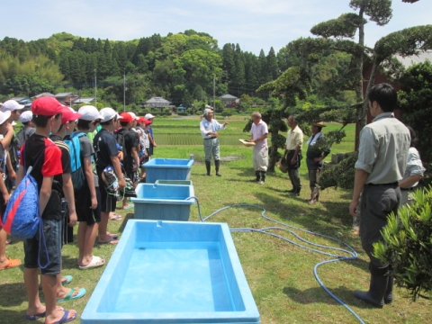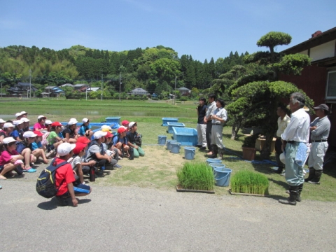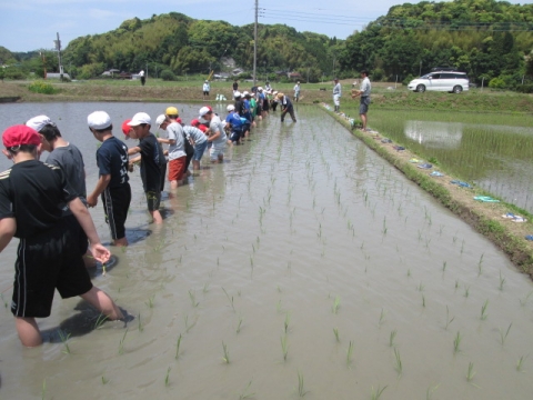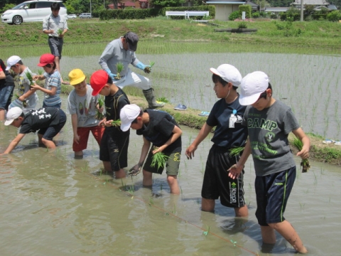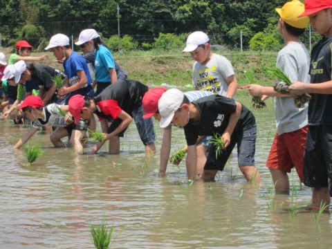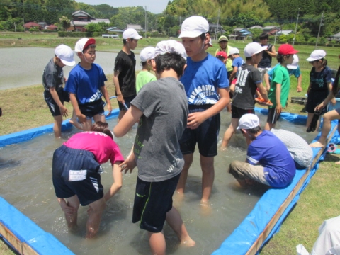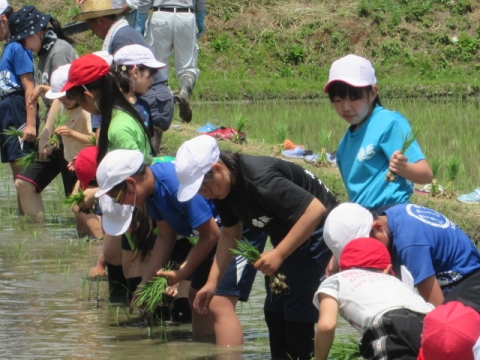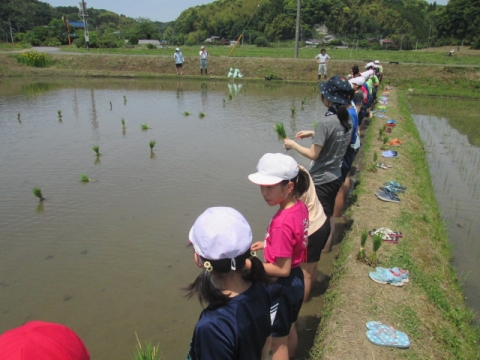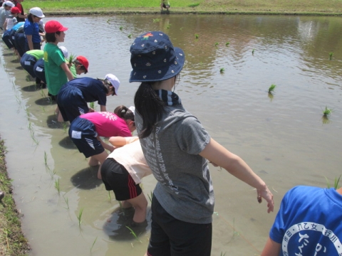 5年生が総合的な学習の時間に田植え体験をしました。市の教育ファーム事業とタイアップしているので、いすみ市荻原地区の有機稲作圃場で、農家の方々の指導の下、手植えによる田植えを行いました。子どもたちは田んぼの土に足を取られながらも、その感触を楽しんでいました。ご協力いただいた講師の皆様、ありがとうございました。