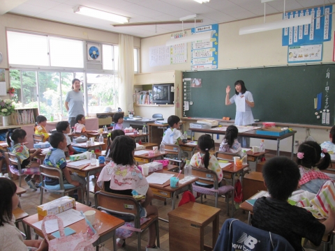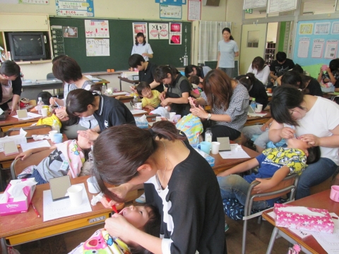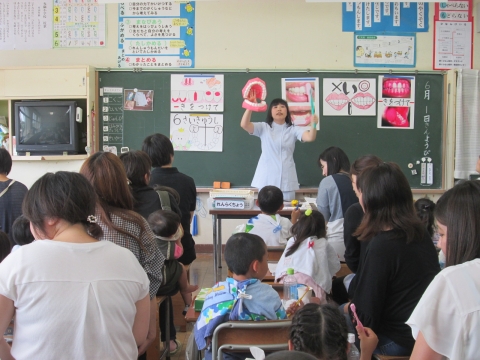 今日は,1年生の親子歯磨き教室と親子給食が行われました!子どもたちも朝からうきうきでした。歯磨き教室では歯科衛生士さんから,歯磨きの大切さと正しい磨き方について紙芝居などを交えながら,わかりやすく教えていただきました。