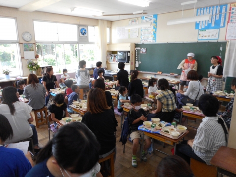 親子給食では,おうちの方も子どもたちもにこにこ,楽しくいただくことができました。