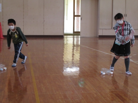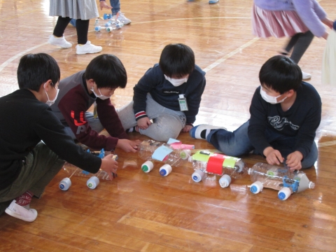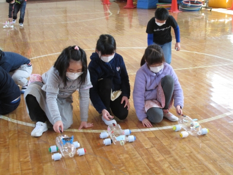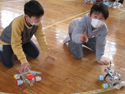 3年生理科授業で,おもちゃを作りました。体育館で動かして楽しみました。みんな,大満足の様子でした。