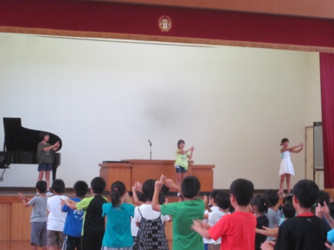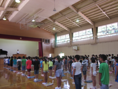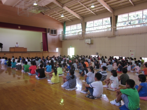 午前10時20分から体育館で、1学期の終業式がありました。まだ校歌がありませんので、全校で手話を交えながら「ありがとうのうた」を合唱しました。校長先生の話では、4月当初に話をした3つの種(あいさつ・ありがとう・仲良し)が芽を出して、この1学期の間に大きく育ってきたというお話がありました。蒸し暑い中でしたが、子どもたちは最後までしっかり話を聞くことが出来ました。