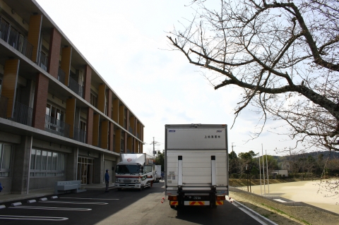 昼すぎから,夷隅小中川校舎から運ばれたものを積んだトラック5台が到着しました。