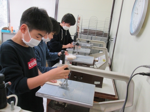6年生は今,図工でテープカッターを作っています。糸のこで切ることも今日で終了。来週から図工室が使えなくなることを知って,ここで作ったり,描いたりしたことをなつかしく思い出しながら,制作しました。