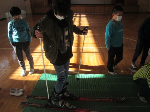 実際に体育館で,スキーを履いてみます!ドキドキ!ワクワク!