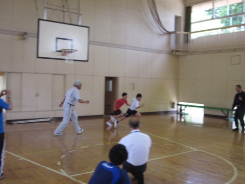 始めに6年教室後方から不審者が侵入したという想定で、全校児童が体育館に避難しました。子どもたちは担任の指示に従って素早く安全に避難することができました。また、6年教室では男子職員が不審者を逃がさないよう真剣に訓練に臨みました。