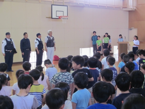 3時間目にいすみ警察署の署員の方々を講師に迎え、不審者侵入を想定した避難訓練と防犯教室が行われました。