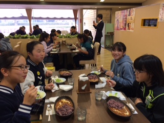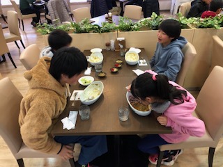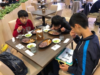 昼食中の写真です、ハヤシライスとカレーライスに夢中です。カレーライスのスパイシーさとハヤシライスのお米の弾力に感激しております!