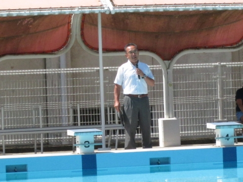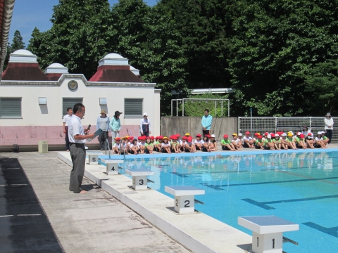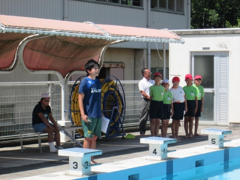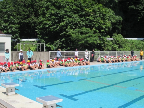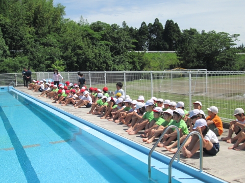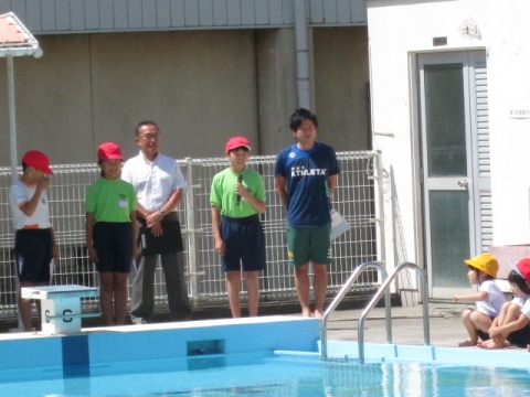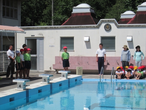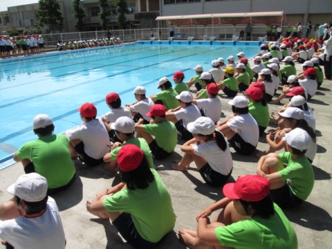 夏の太陽が照りつける中、2校時にプール開きがありました。今日は残念ながら水温が低くプールへの入水はできませんでしたが、プールサイドで式だけを行いました。校長先生からは、水泳は自分の命を守ることにつながる大切な学習であることが話されました。約束や決まりをしっかり守って、楽しく安全に水泳学習を進めていきたいと思います。
