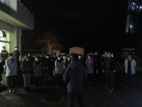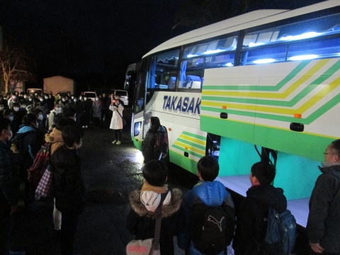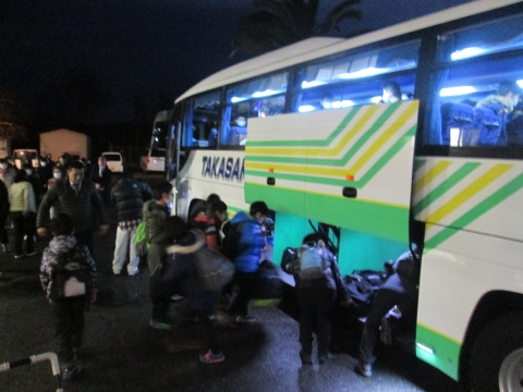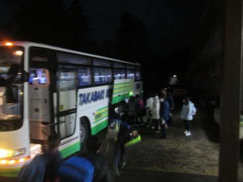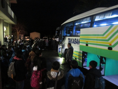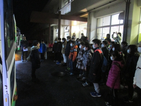 午前6時,薄暗い中でしたが,5年生の元気な顔がそろいました。いよいよスキー教室のスタートです。出発式をして,たくさんの保護者の皆様に見送られ,6時20分に2台のバスは新潟県湯沢町に向けて出発しました。