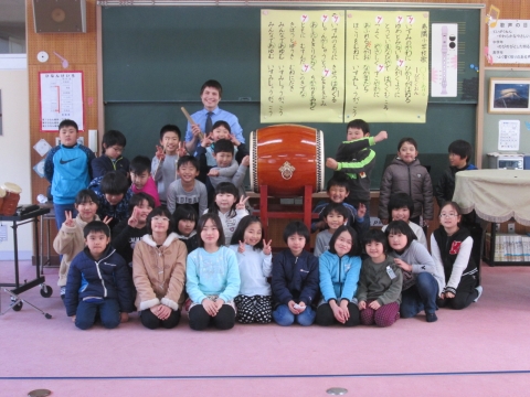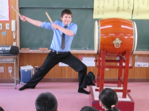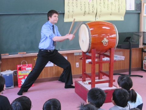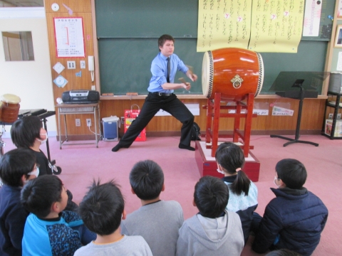 ロング昼休みに,ALTのジャクソン先生が音楽室で和太鼓の演奏をしてくださいました。先生は,アメリカの大学時代に「和太鼓部」に入っていたそうです。バチを振り上げる凜々しい姿に見ていた3年生は大きな拍手を送っていました。太鼓のリズムは,日本の唱歌で覚えたそうです。