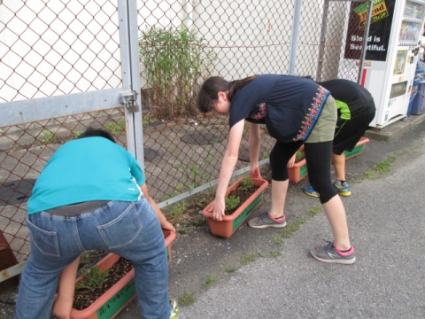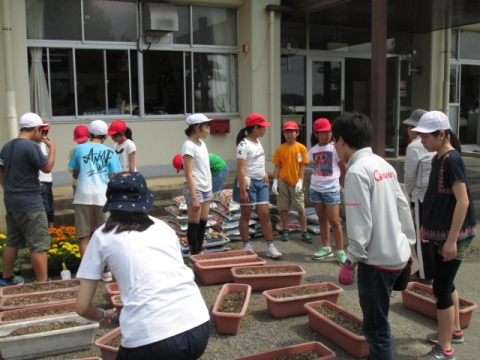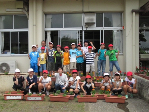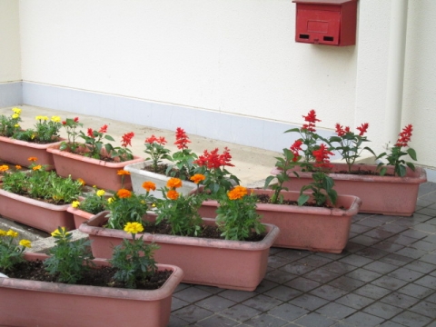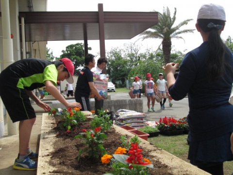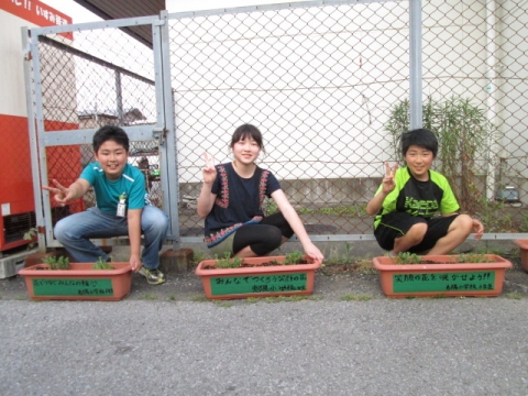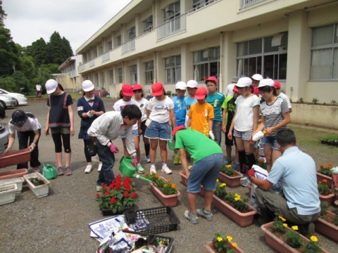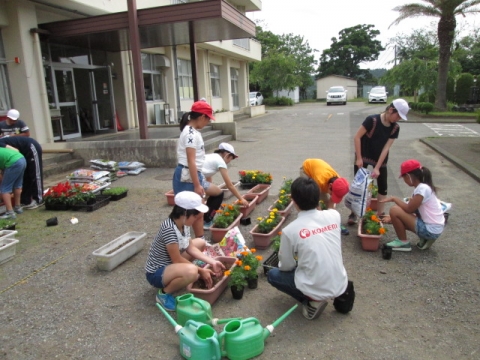 を利用させていただき、花苗やプランター用の土などを用意していただきました。また、担当の方にもご来校いただき、一緒に活動していただきました。ありがとうございました。お陰様で玄関付近が夏らしくなりました。