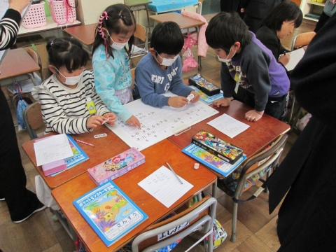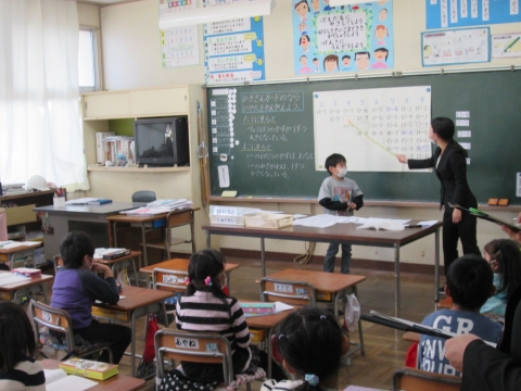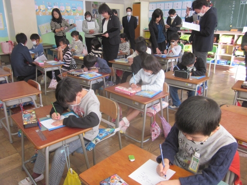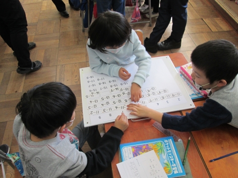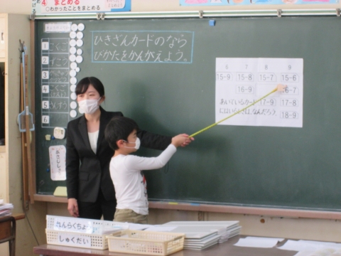 本校では,「自分の考えを進んで表現し,ともに高め合う児童の育成」という研究主題を掲げ,算数科の学習を通して研究を進めています。今日は,検証授業ということで,1年2組で研究授業が展開されました。子どもたちはひきざんカードを並び方のきまりを見つける学習に真剣に取り組んでいました。