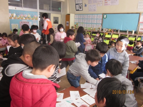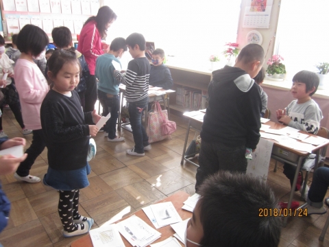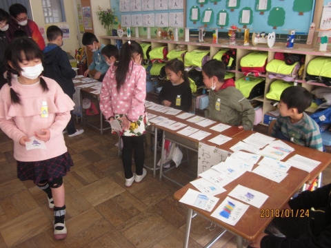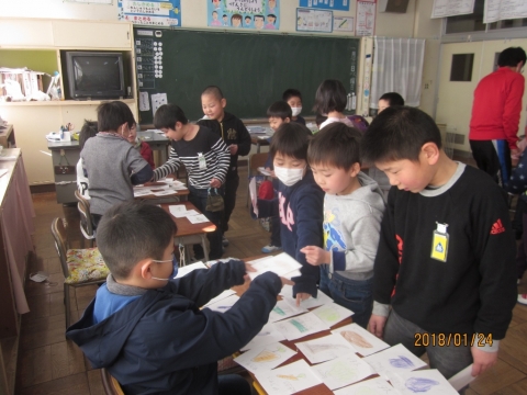 1年生が国語の学習で,おみせやさんごっこをしました。グループごとに,店で売る品物の絵と名前を書いたカードを並べ,「お店の人」と「お客さん」の言葉のやり取りを楽しんでいました。