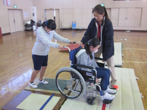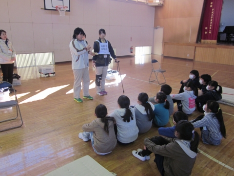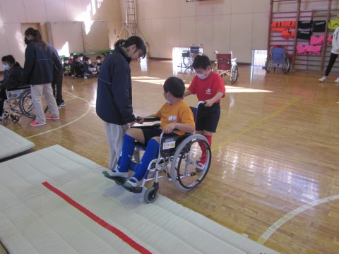 4年生が総合的な学習の時間の一環で,いすみ市役所福祉課やいすみ苑の職員の方々を講師にお迎えして,福祉体験学習を行いました。始めに教室で,プレゼンによる認知症についての学習をしました。次に,場所を体育館に移動して,車いす体験・高齢者や目の不自由な人の体験などを行いました。