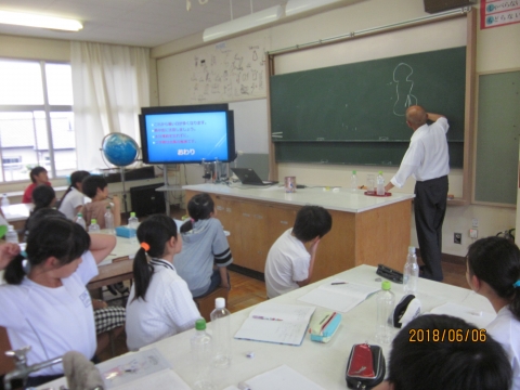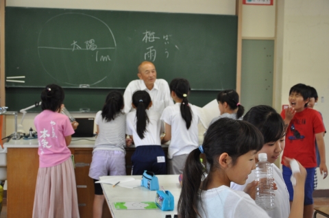 第1回目の授業では,天候の移り変わりや気象についての日本記録など,クイズを交えて楽しく学ぶことができました。また,ペットボトルを使用しての雲の作成実験では,雲ができると驚きの声があがり,たくさんの笑顔が見られました。