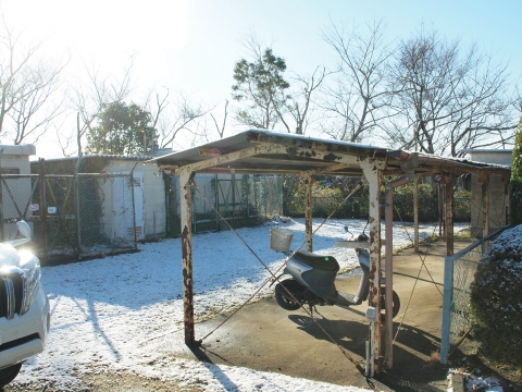 正門入って左側の砂利駐車場内にリサイクルステーションを設置しております。