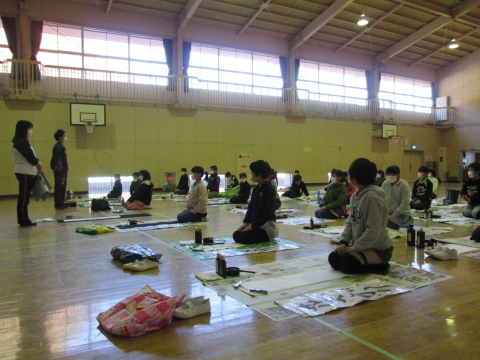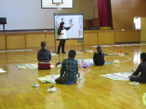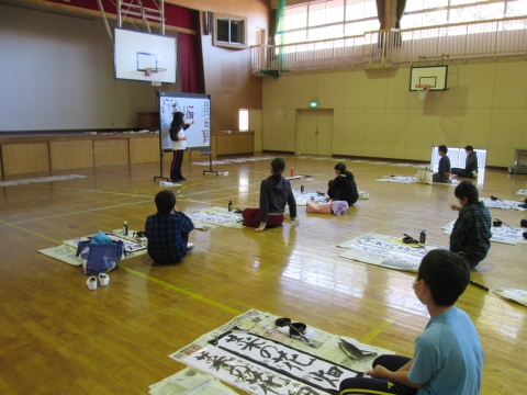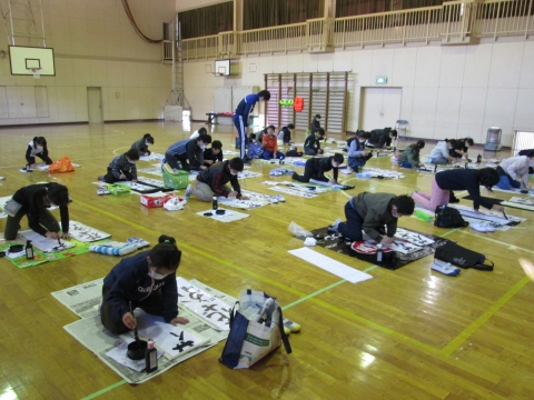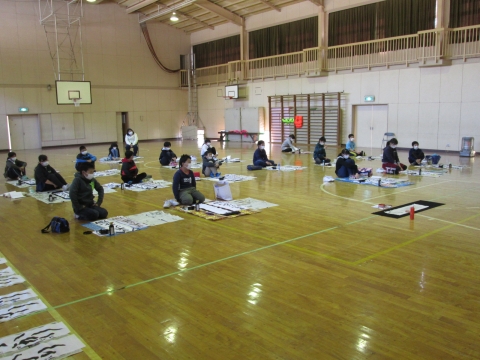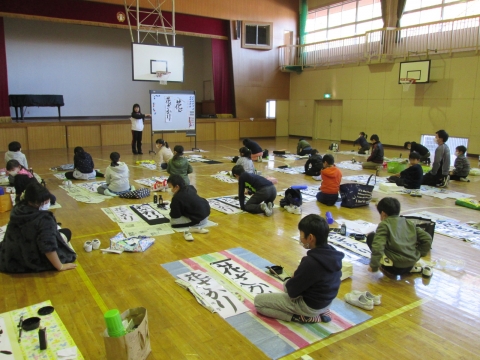 今週から3年生以上の学年で,書き初め練習が始まりました。今日は,4年生と6年生が体育館で書写担当の先生から指導を受けました。気温が低く寒い中でしたが,子どもたちは真剣に練習に励んでいました。