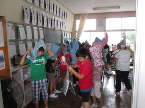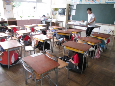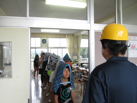 防災の日を受けて,午前9時45分から大地震を想定した避難訓練を実施しました。今回は,グラウンドの状態が悪かったので,安全な場所に身を隠し,廊下に並ぶまでを行いました。子どもたちは,静かにそして素早く行動できました。