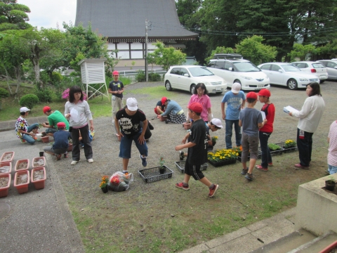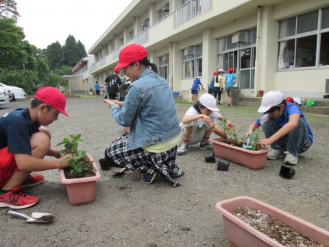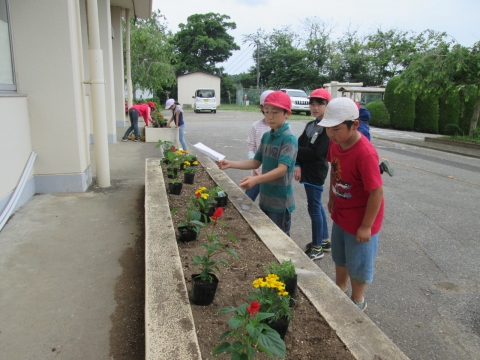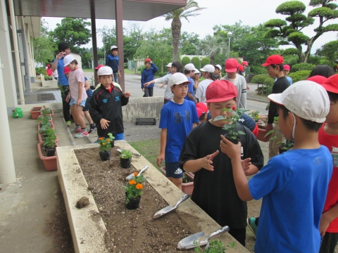 3時間目に,6年生が南側花壇並びにプランターに花を植えました。コメリさんのお店の方も来てくださり,花の植え方等レクチャーいただきました。