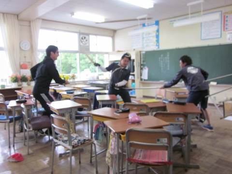 始めに6年教室後方から不審者が侵入したという想定で、全校児童が体育館に避難しました。子どもたちは担任の指示に従って素早く安全に避難することができました。また、6年教室では男子職員が不審者を逃がさないよう真剣に訓練に臨みました。