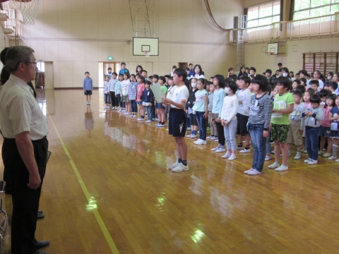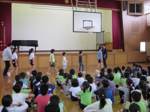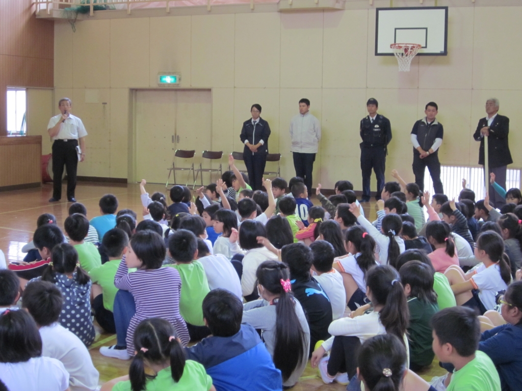 全員が避難した体育館では、引き続き声かけ対応訓練がありました。登下校中に不審者から声をかけられたらどうしたらよいかを具体的に指導していただきました。