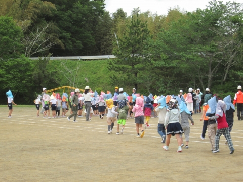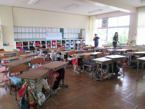 5校時に,地震想定の避難訓練が行われました。緊急地震速報の後、大きな揺れを再現した放送が流れると,子どもたちは,素早く机の下にもぐり,その後グラウンドへと速やかに避難することができました。どの児童も真剣に訓練に臨むことができました。