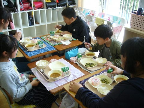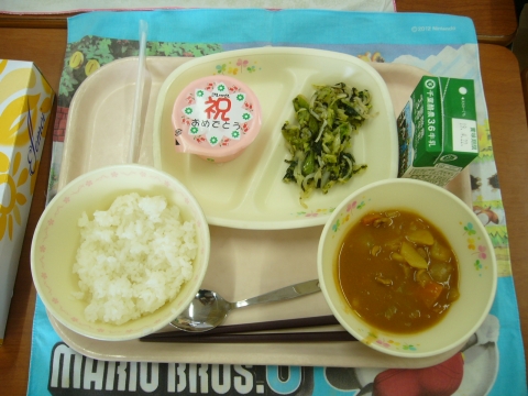 今日から1年生の給食が始まりました。今日は子どもたちが大好きなカレーライスです。おかわりをするお子さんも多かったです。