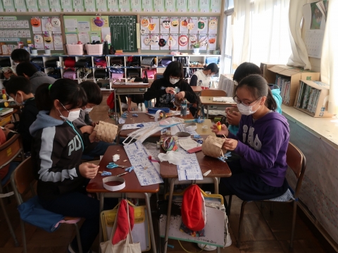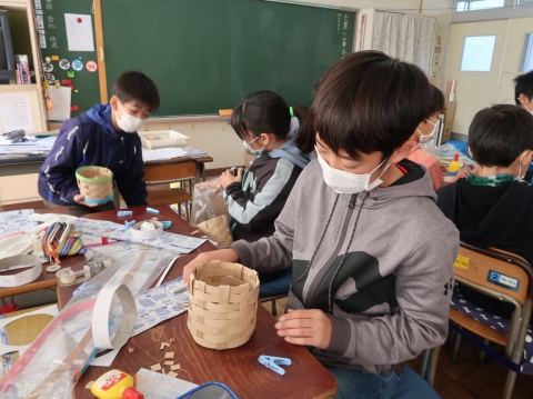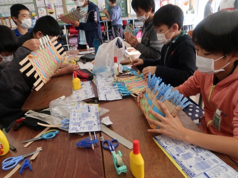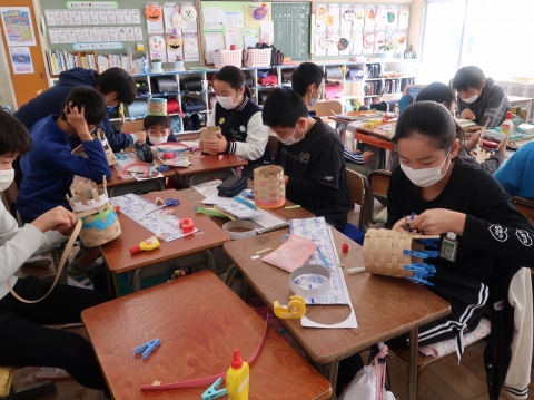 次は工作に挑戦。昔から伝わる技法を使って,編んだり組んだりして,かごや手さげを作りました。