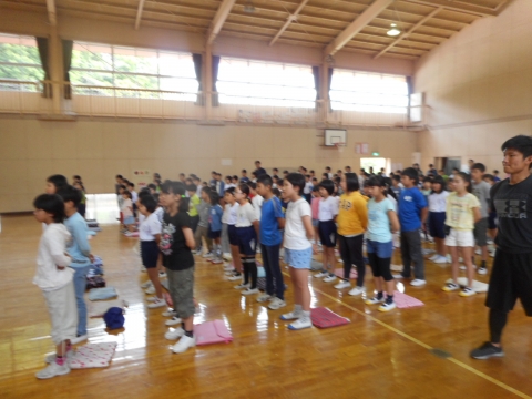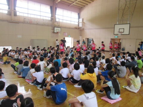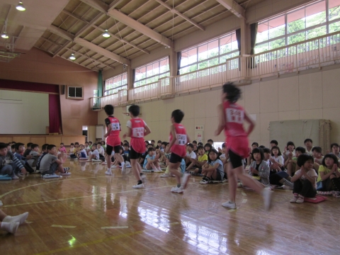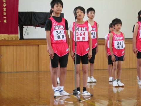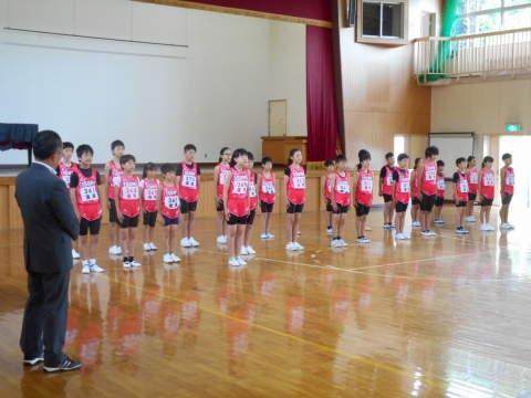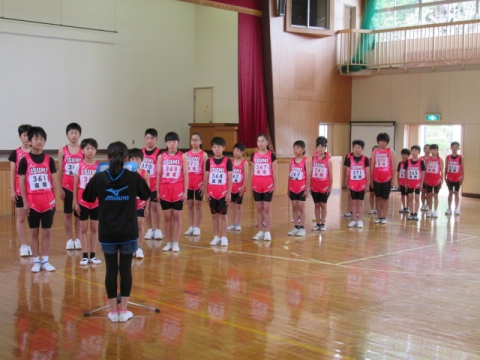 午前8時05分から体育館で、20日(日)に開催される郡市陸上競技大会に向けての壮行会がありました。鮮やかなピンク色のユニホームに身を包んだ選手たちが入場すると大きな拍手がわき上がりました。はじめに選手一人一人の自己紹介と大会に向けての意気込みが発表されました。そして、全校児童からのエールや児童代表・選手代表あいさつの後、最後に校長先生から、自分の記録を更新できるように全力を出し切ってほしいという励ましのお話がありました。