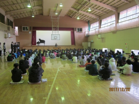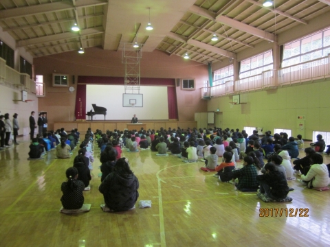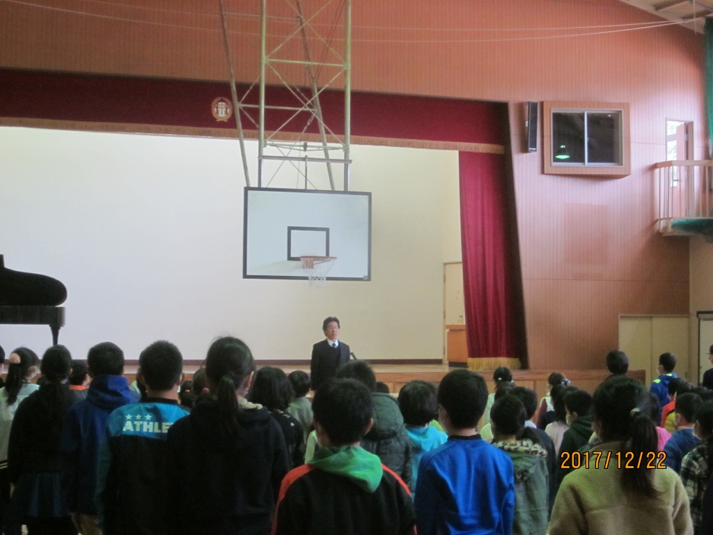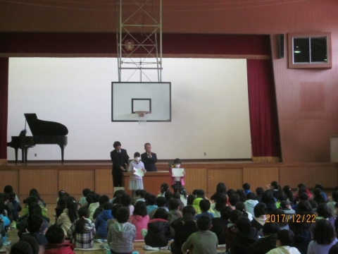午前10時20分から体育館で,2学期の終業式がありました。校長先生からは,運動会をはじめとする学校行事や対外的な行事をとおして,今学期の子どもたちの成長を讃えるお話がありました。式終了後には,生徒指導担当からの話やこども県展をはじめとする図工関係の賞状伝達がありました。