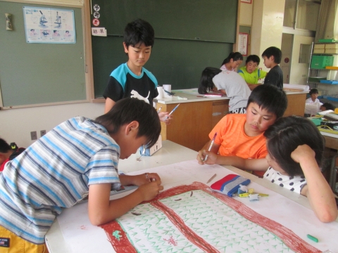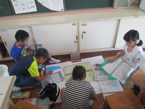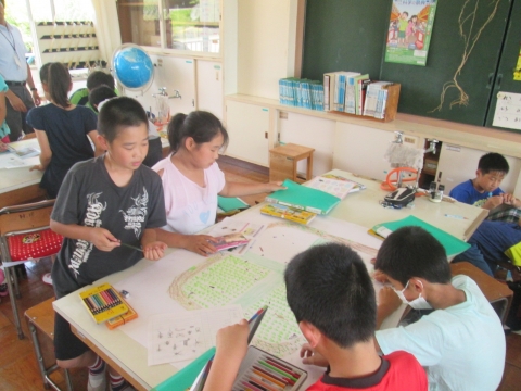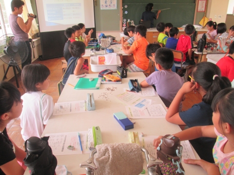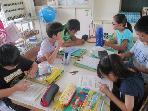 5年生が総合的な学習の時間を使って、教育ファームの学習をしています。今日は3,4時間目に、古代米と現代のお米の話というテーマで、古代米の特徴や品種改良について学びました。後半は、自分たちで育てているバケツ稲の生長を観察しました。
