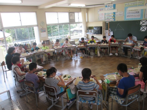 今日は,1学期最後の教育ファームということで,講師の先生方を囲んで給食で会食をしました。