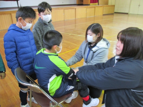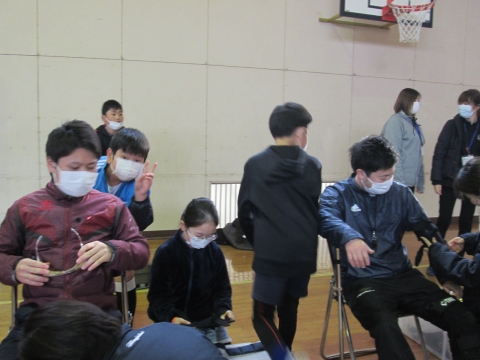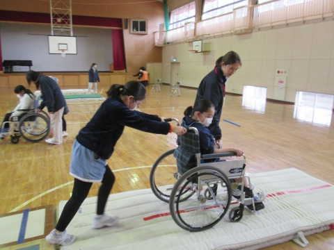 5・6時間目,いすみ市役所福祉課といすみ苑の皆様にご来校いただきました。5校時は認知症についての講義を聴き,6校時は体育館にて,車椅子体験や体の自由を制限しての動きの体験などを行いました。