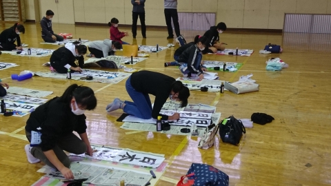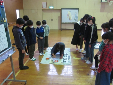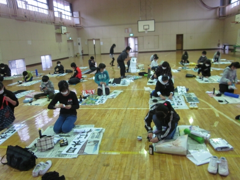 みんないつもと違う太い筆を使いながら,一生懸命練習に取り組みました。