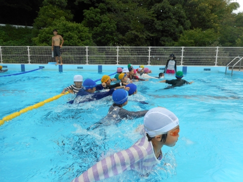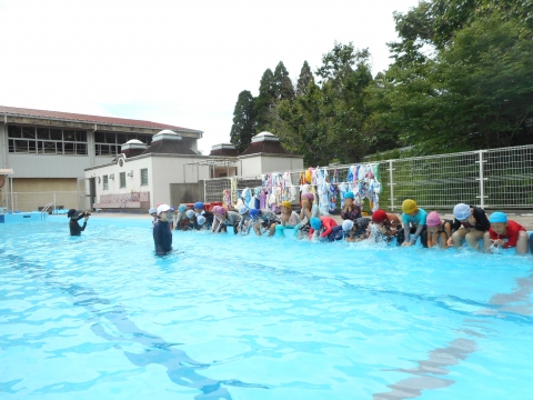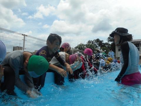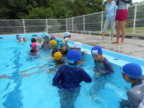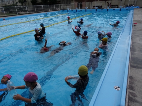 1年生にとっては初めての着衣水泳です。万が一の事故等に備え,衣服を着たままでの水泳の難しさや,その時に浮くこと,何かにつかまることなどを学びました。
