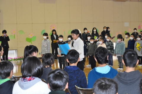 6年生からは,澄み,そして力強い合唱や小学校生活を振り返る劇の発表がありました。最後には,運動会紅白応援団を中心として在校生にエールをもらいました。