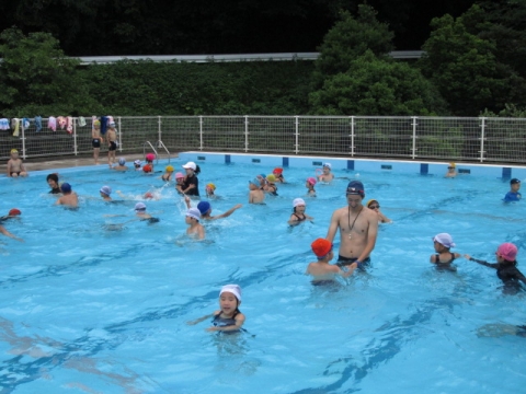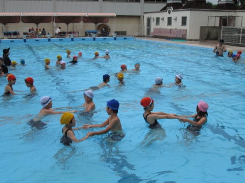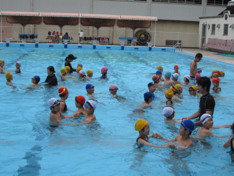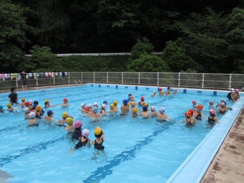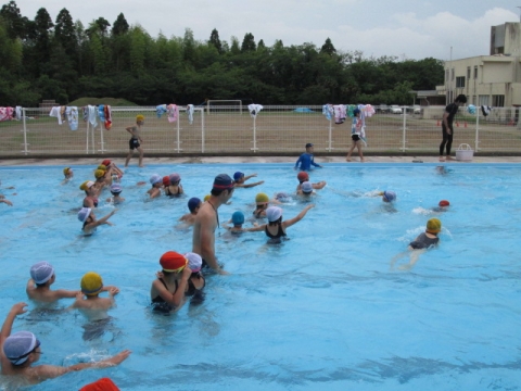 今日は曇り空でしたが、気温や水温が高く,低学年の水泳学習が実施されました。2年生が1年生のお世話をしながら、楽しく学習を進めていました。