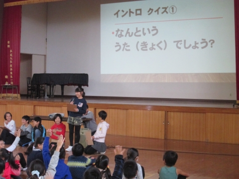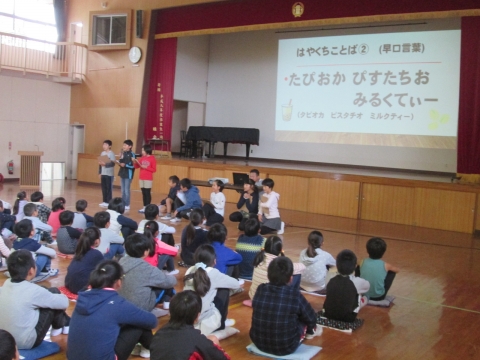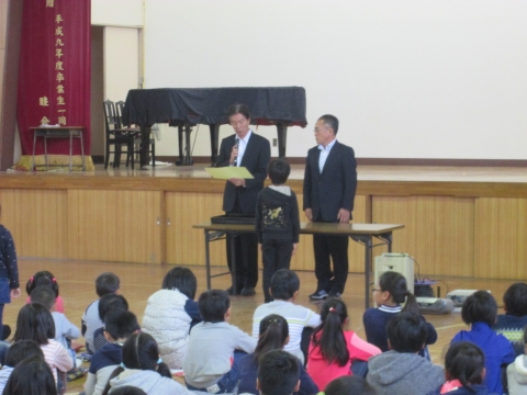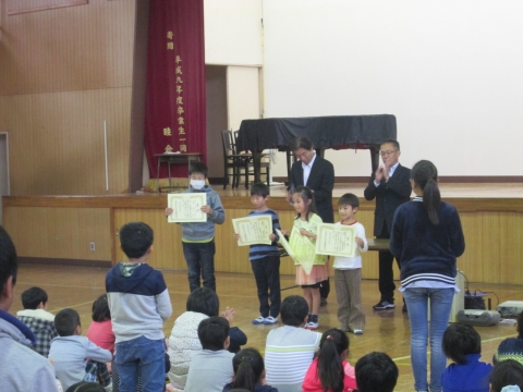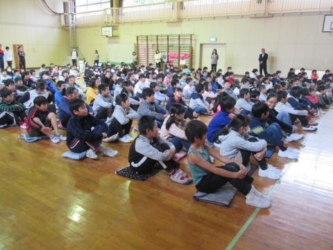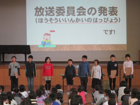 午後1時から体育館で,児童集会がありました。今回は,放送委員会の発表でした。アナウンスで必要な早口言葉の紹介,昔話クイズ,イントロ当てクイズなど,楽しい一時をを過ごすことができました。最後に,賞状伝達があり,夏休みに頑張った自由研究や作文・ポスターなどの入賞者が紹介されました。